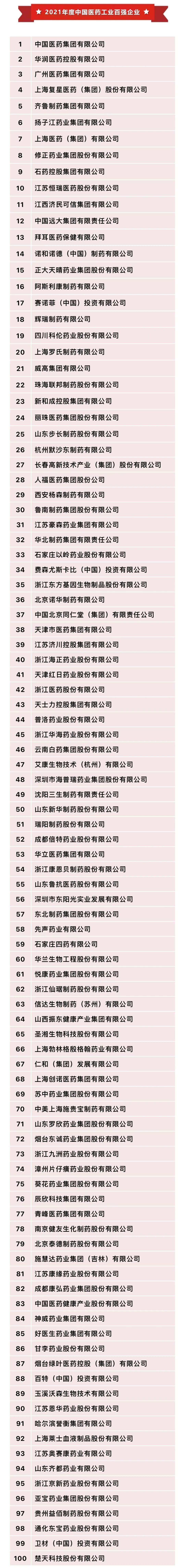 指标依据:按2021年医药工业企业法人单位的主营业务收入前100位排序