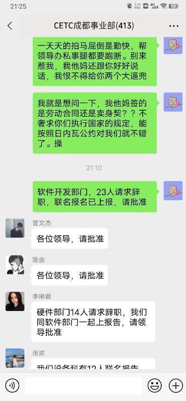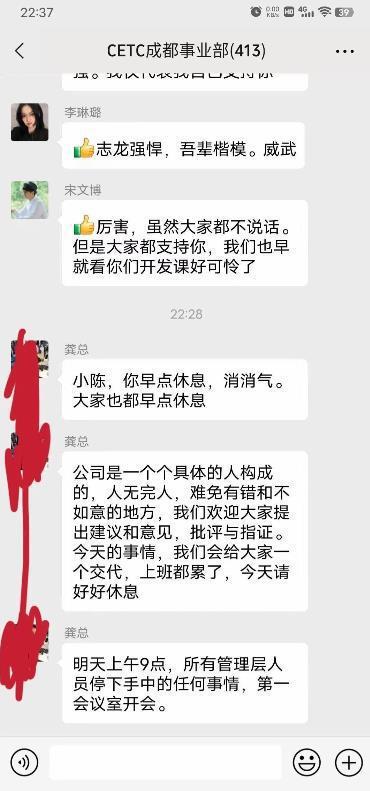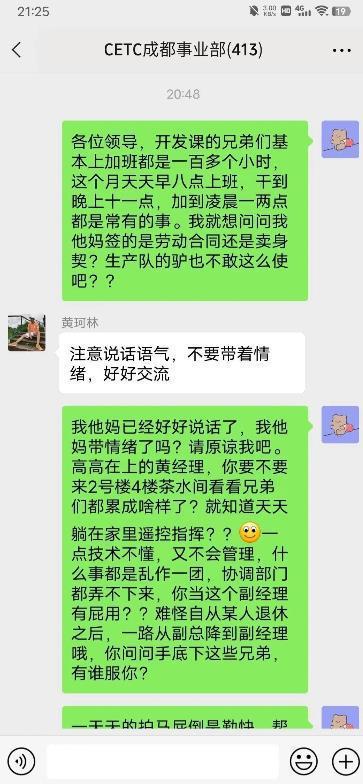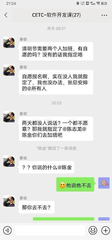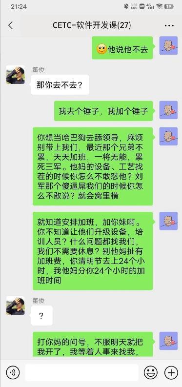 4月4日,疑似“中国电科清明节强制加班怒怼领导”的相关聊天记录在网络上流传。