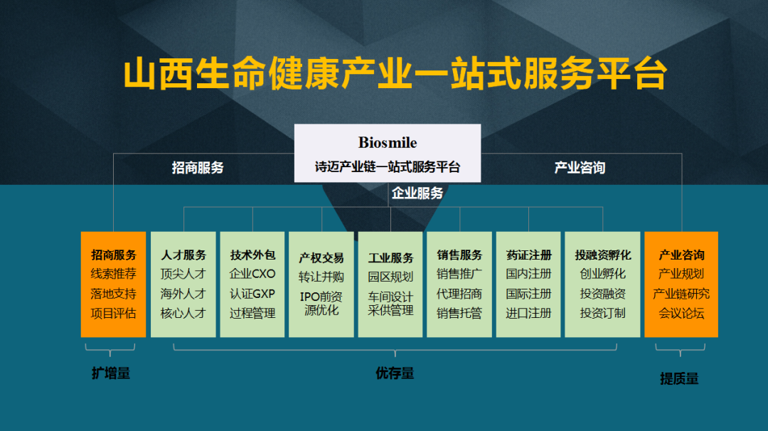 山西领创生命健康创新将承载太原生物医药产业集群发展的使命,依托mg电子生命健康产业链一站式服务平台(Biosmile),导入大项目好项目的同时,围绕企业研发生产环节的关键节点需求,为入园企业提供从实验室装修、团队组建、注册申报、委托销售等“端到端”的一站式服务;力争帮助企业缩短上规、上高、上精,上市的时间,在太原构建专业化的生命健康产业生态。