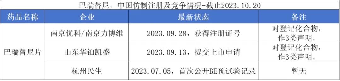 2023年10月13日,南京优科生物子公司南京力博维制药研发的巴瑞替尼片仿制药获批上市,这也是国内首个获得批准的巴瑞替尼仿制药。今年9月,泰恩康全资子公司山东华铂凯盛生物的巴瑞替尼片上市申请获国家药监局受理。不过,由于原研化合物专利的存在,两家公司都已进行专利声明:在2029年3月10日不上市销售。此外,杭州民生在2023年7月首次公开巴瑞替尼的BE预试验记录。