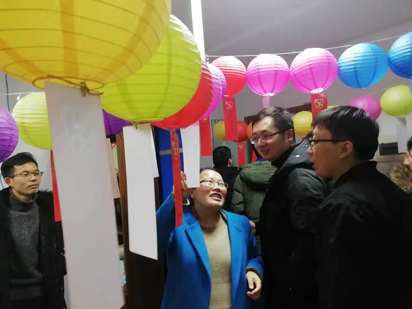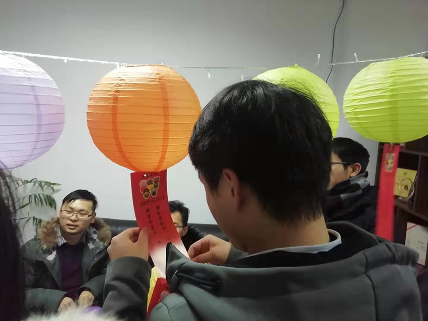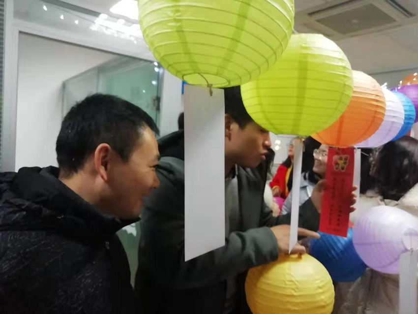 每个灯笼下都着的是公司精心挑选的100余条灯谜,融知识性、趣味性为一体的经典谜语悬挂在灯笼下供员工竞猜。